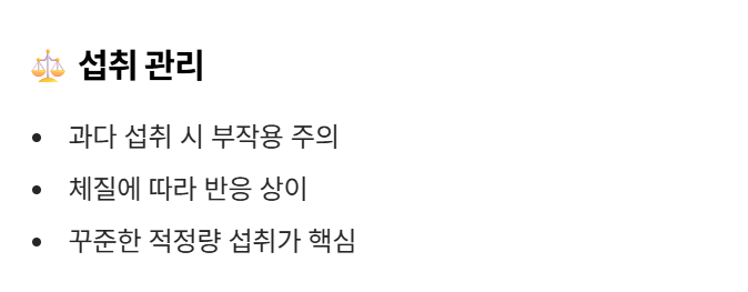 두 번째는 섭취 관리입니다. 과다 섭취 시 부작용입니다.