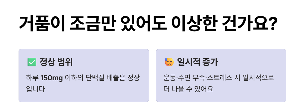 그렇다고 거품이 조금 보인다고 바로 이상한 건 아니에요. 정상적으로도 하루 150mg 정도의 단백질은 소변으로 나옵니다. 운동을 심하게 하거나 잠을 못 자거나 스트레스를 받으면 조금 더 나올 수 있어요. 문제가 되는 건 이 수치가 지속적으로 높아지는 경우입니다.