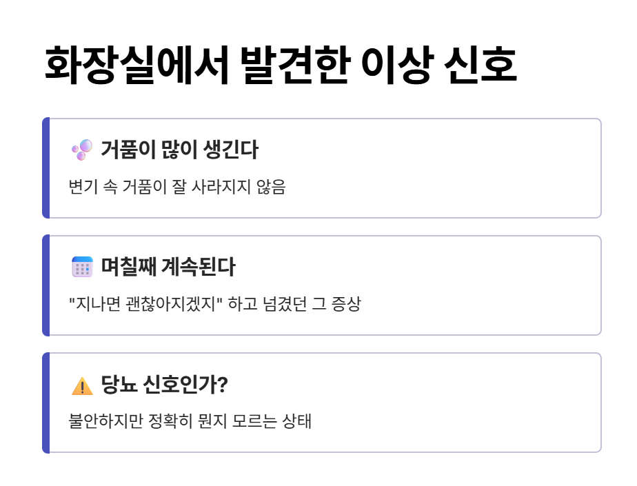 화장실에서 소변을 보다가 거품이 많이 생기면 한 번쯤 이상하다는 생각이 드시죠? 저도 그랬어요. 사탕이나 초콜릿을 먹은 날 저녁에 유독 거품이 많이 끼고, 잘 없어지지 않는 경험을 했거든요. 며칠 지나면 괜찮아지겠지 했는데 그 증상이 계속됐습니다. 당뇨 신호일 수도 있다는 말을 들은 적이 있어서 괜히 불안해졌어요. 알고 보니 거품뇨의 원인은 생각보다 명확했고, 신장과 직접 연결된 문제였습니다.