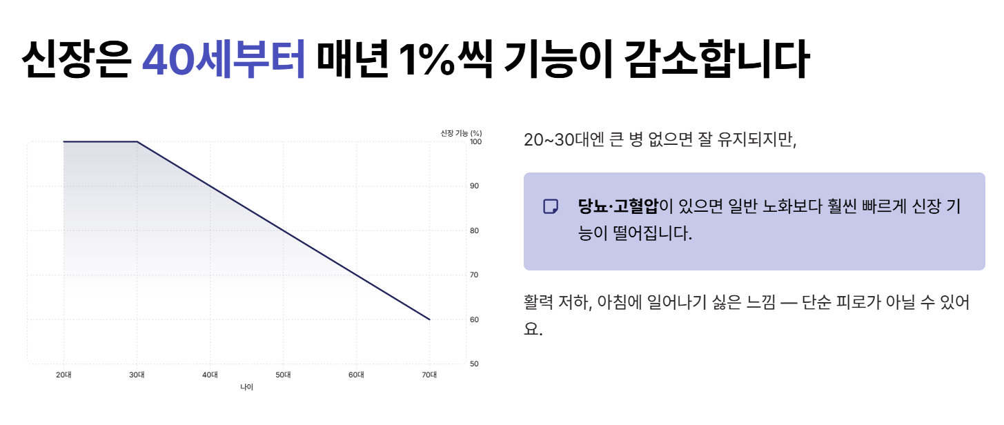 신장은 40세부터 매년 기능이 1%씩 감소한다고 해요. 이게 생각보다 무서운 수치예요. 20~30대에는 큰 병이 없으면 잘 유지되지만, 당뇨나 고혈압이 있으면 일반적인 노화보다 훨씬 빠르게 신장 기능이 떨어집니다.