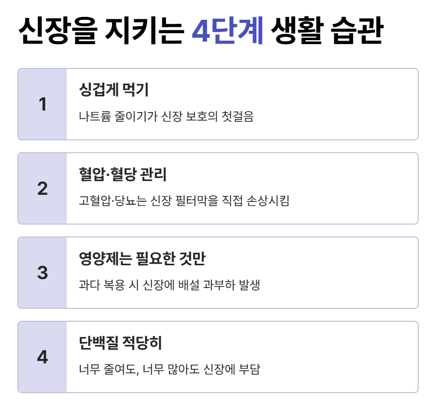 A. 나트륨 섭취를 줄이고, 혈압과 혈당을 꾸준히 관리하는 것이 핵심입니다. 여기에 충분한 수분 섭취와 과도한 단백질·영양제 섭취를 피하는 것도 중요합니다.