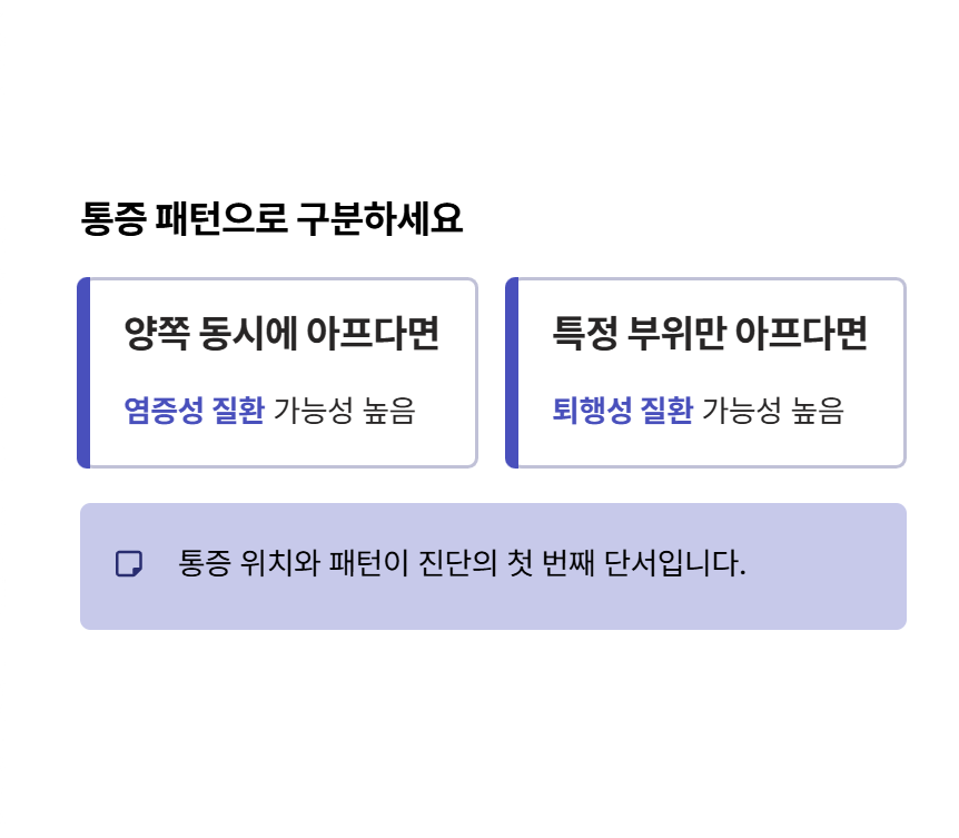 양쪽 동시에 아프면 염증성, 특정 부위만 아프면 퇴행성일 가능성이 높습니다.