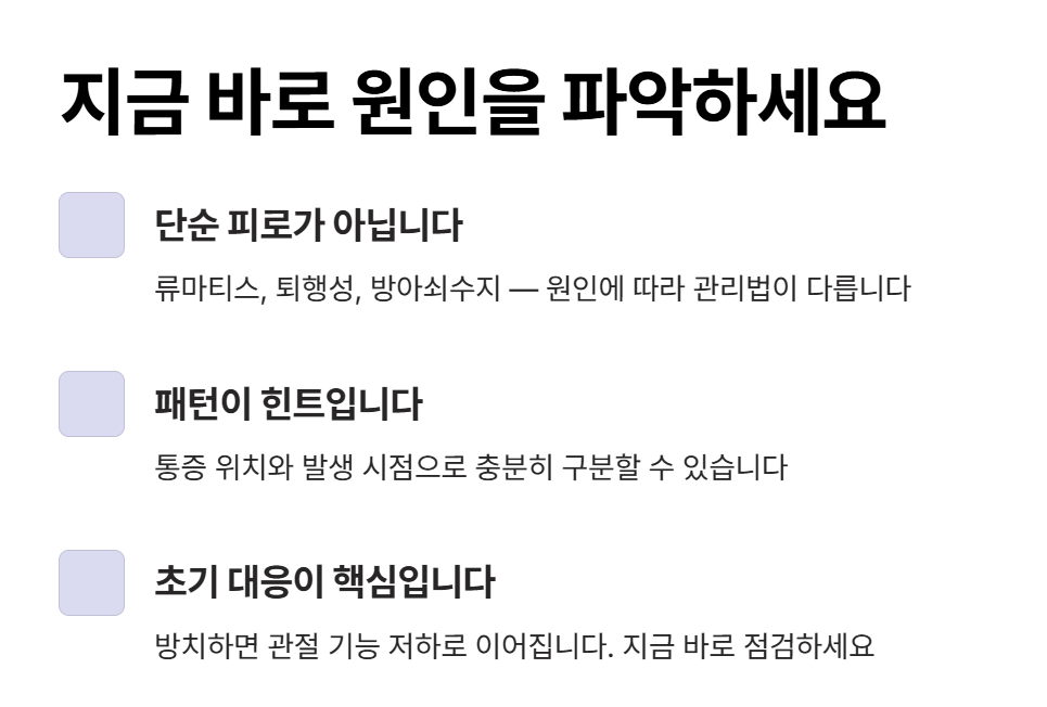 손가락마디 통증은 단순한 피로가 아니라 다양한 질환으로 발생할 수 있습니다. 특히 류마티스관절염, 퇴행성관절염, 방아쇠수지증후군은 증상이 비슷하지만 원인과 진행 방식이 다릅니다. 통증 위치와 발생 패턴을 통해 충분히 구분할 수 있으며 이에 맞는 관리가 필요합니다. 초기 대응이 늦어지면 관절 기능 저하로 이어질 수 있으므로 증상이 지속된다면 반드시 원인을 파악하고 관리하는 것이 중요합니다.
