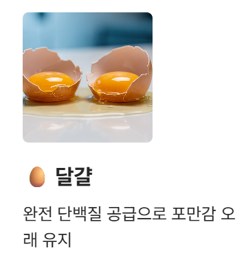 • 달걀: 단백질 공급으로 포만감 유지