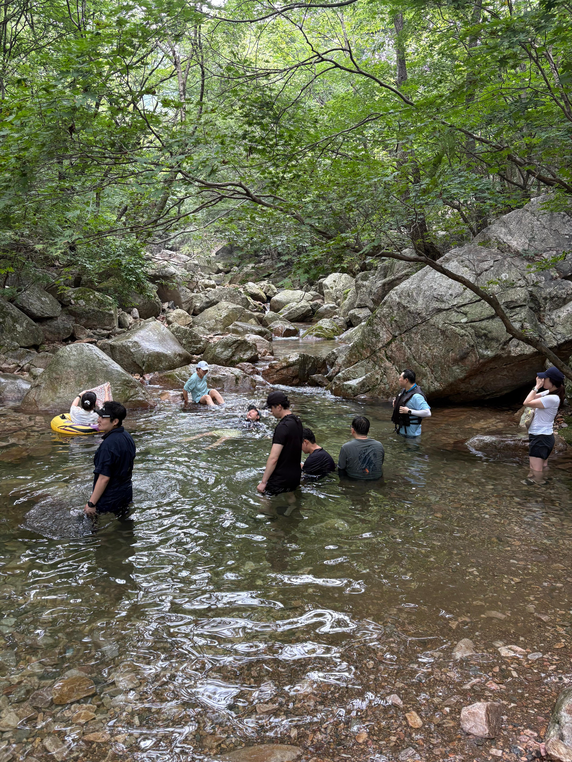 펜션에서 차로 5~10분 거리에는 중원계곡이 있다. 주말이라 그런지 계곡 주변은 이미 많은 사람들로 붐볐다. 원하는 포인트를 찾기 어려워 계곡을 따라 걸어가다가, 중원계곡 폭포 인근 입수금지 라인 바로 앞에 자리를 잡았다.
