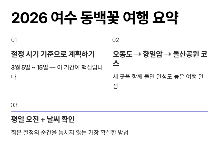 2026년 여수 동백꽃 개화 시기는 1월 중순부터 시작해 3월 초에서 중순 사이에 절정을 맞이합니다. 가장 추천되는 방문 시기는 3월 5일부터 15일 사이입니다. 오동도를 중심으로 향일암과 돌산공원까지 함께 둘러보면 더욱 완성도 높은 여행이 됩니다. 중요한 것은 개화가 아니라 절정 시기를 기준으로 계획하는 것입니다. 짧은 최고의 순간을 놓치지 않기 위해 미리 준비하는 것이 가장 중요합니다.