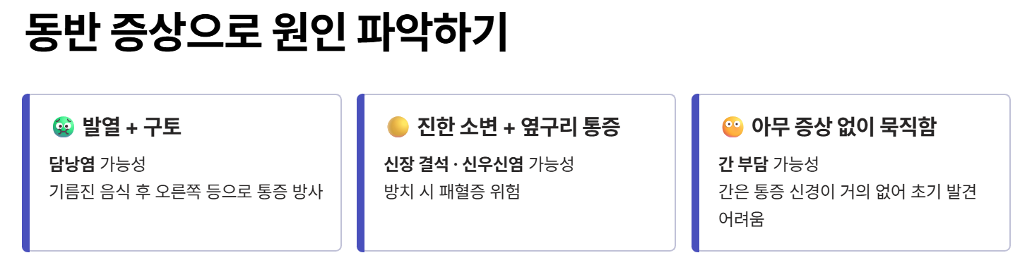 발열이나 구토가 함께 나타나면 담낭염(cholecystitis) 가능성이 있습니다. 담낭염이란 담낭에 염증이 생긴 상태로, 기름진 음식을 먹은 뒤 오른쪽 등까지 통증이 퍼지는 특징이 있습니다. 소변 색깔이 진하거나 옆구리까지 통증이 이어진다면 신장 결석이나 신우신염(pyelonephritis)을 의심해볼 수 있습니다. 신우신염이란 신장에 세균 감염이 생긴 것으로, 방치하면 패혈증으로 이어질 수 있어 주의가 필요합니다.
