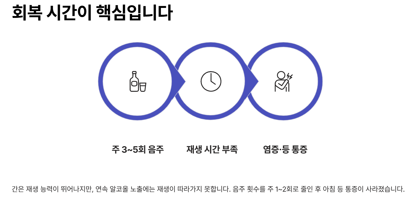 일반적으로 간 건강을 위해서는 음주 횟수를 줄이는 게 최선이라고 알려져 있지만, 실제로 경험해보니 '횟수'만큼이나 '회복 시간'도 중요하더군요. 간은 재생 능력이 뛰어난 장기지만, 연속으로 알코올에 노출되면 재생이 따라가지 못합니다. 저는 술을 주 1~2회로 줄이고 나서 아침에 일어날 때 느끼던 가벼운 등 통증이 사라졌습니다. 이 경험 이후 간이 단순히 술을 분해하는 장기가 아니라 전신 건강과 직결된다는 걸 체감했습니다.