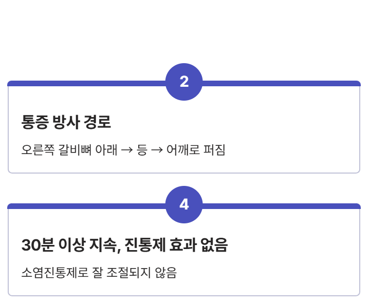 - 통증이 오른쪽 갈비뼈 아래에서 시작해 등, 어깨로 퍼짐