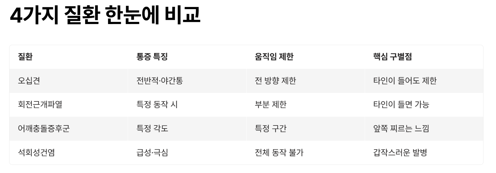 어깨통증은 단순 오십견이 아니라 다양한 질환으로 발생할 수 있습니다. 특히 오십견, 회전근개파열, 어깨충돌증후군, 석회성건염은 증상이 비슷해 혼동하기 쉽습니다. 하지만 통증의 발생 방식과 움직임 제한 여부를 통해 충분히 구분할 수 있습니다. 질환에 따라 관리 방법이 다르기 때문에 정확한 판단이 매우 중요합니다. 통증을 방치하지 말고 원인에 맞는 대응을 하는 것이 빠른 회복으로 이어집니다.