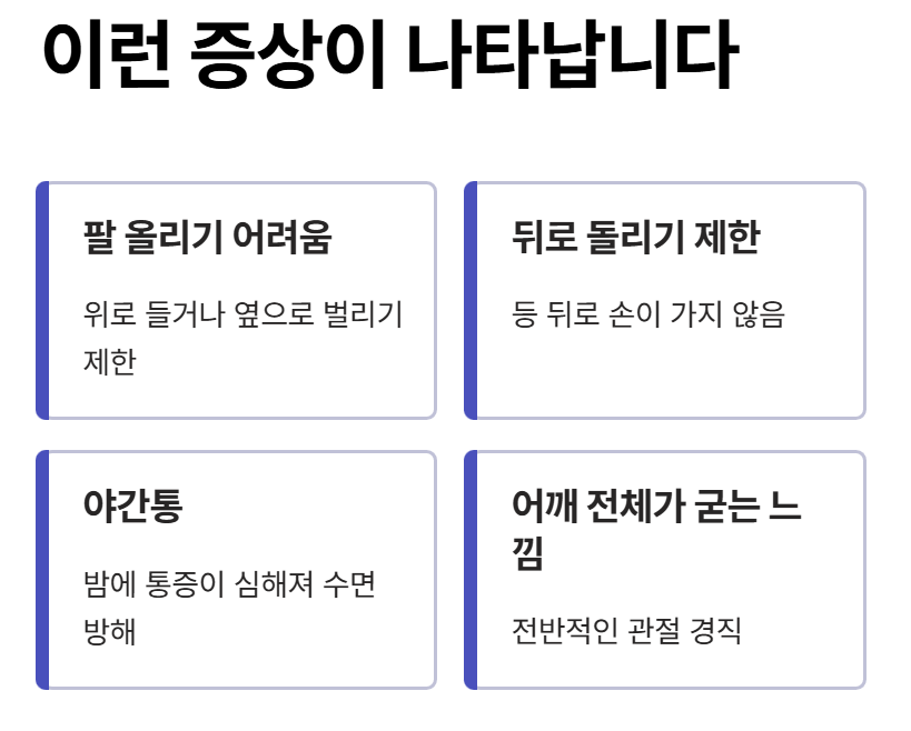 오십견은 어깨 관절막이 굳어 움직임이 전반적으로 제한되는 질환입니다. 시간이 지날수록 점점 더 움직이기 어려워지는 특징이 있습니다.