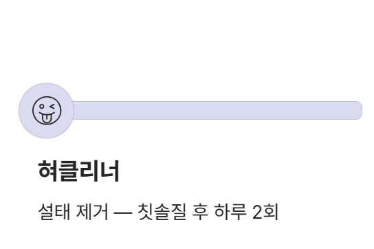 - 반드시 칫솔질 후에 사용하세요. 혀클리너로 설태를 제거한 후 다시 칫솔을 쓰면 세균이 치아로 옮겨갈 수 있습니다.