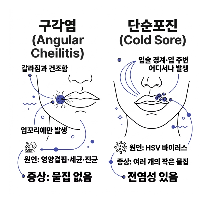 많은 분들이 입술의 염증을 모두 같은 것으로 생각하시는데, 구각염(口角炎)과 단순포진은 명확히 다른 질환입니다. 구각염은 입꼬리 부분에만 국한되어 발생하며, 영양 결핍이나 세균·진균 감염이 원인입니다. 주된 증상은 갈라짐과 건조함이고, 헤르페스와 달리 물집이 생기지 않습니다. 반면 단순포진은 입술 경계 부위나 입술 자체, 입 주변 어디든 발생할 수 있으며 특징적인 물집이 여러 개 모여 나타나는 것이 가장 큰 차이점입니다.
