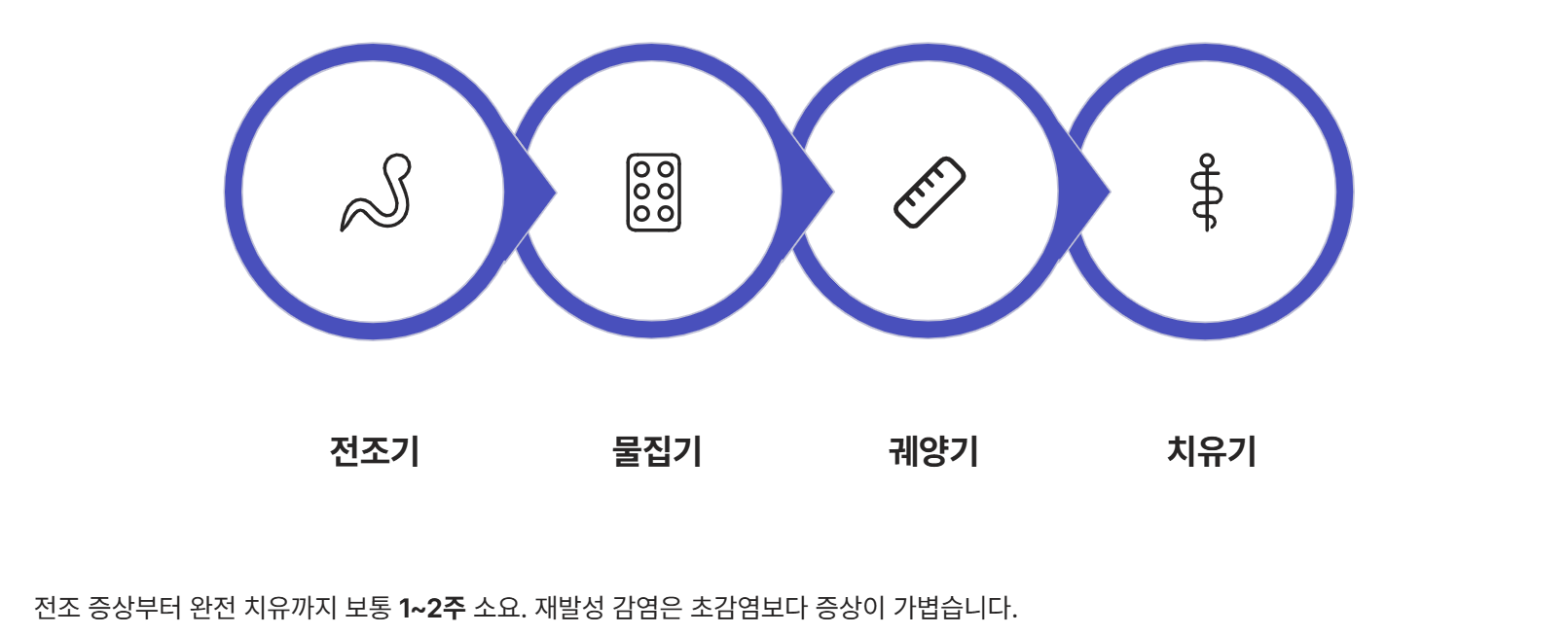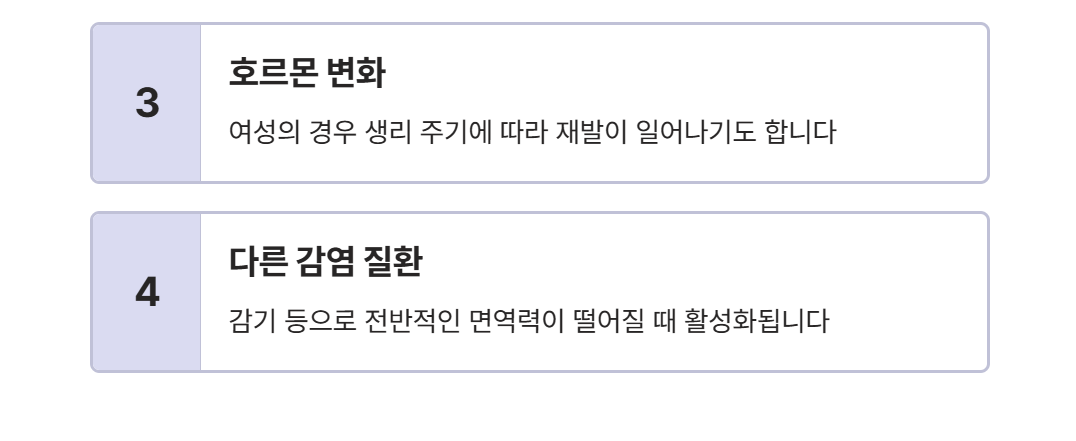 - 여성의 경우 생리 주기에 따른 호르몬 변화로 인해 재발이 일어나기도 합니다.