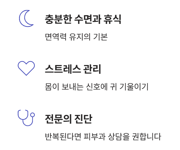 - 신체적 피로와 수면 부족이 누적되면 면역력이 떨어져 재발 위험이 높아집니다.