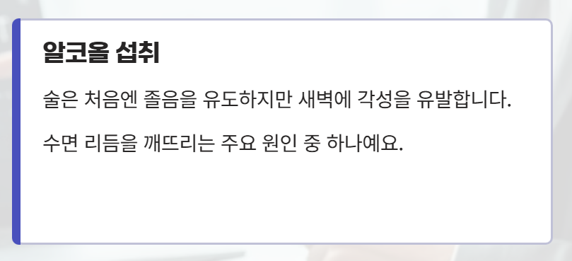 또한, 술(음주)도 수면 리듬을 깨뜨리는데요. 특히, 술은 처음엔 졸음을 유도하지만 오히려 새벽에 각성을 유발합니다.