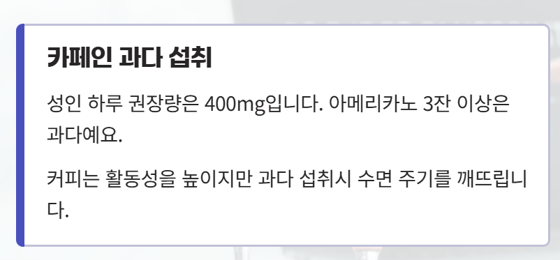 직장인들이 자주 마시는 음료는 커피입니다. 커피에는 카페인이 들어가 있어, 활동성 및 집중력을 높여주는데요. 과다하게 섭취 했을 때는, 수면 주기를 깨뜨리는 원인이 됩니다. 성인 기준으로 하루 권장량은 400mg입니다. 아이스아메리카노를 기준으로, 3잔 이상 마시게 되었을 때 카페인 과섭취로 볼 수 있습니다.