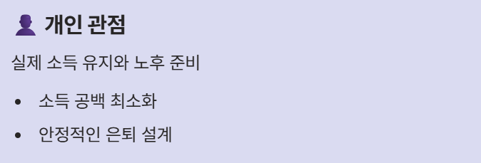 두 번째는 개인 관점입니다. 실제 소득 유지와 노후 준비입니다.