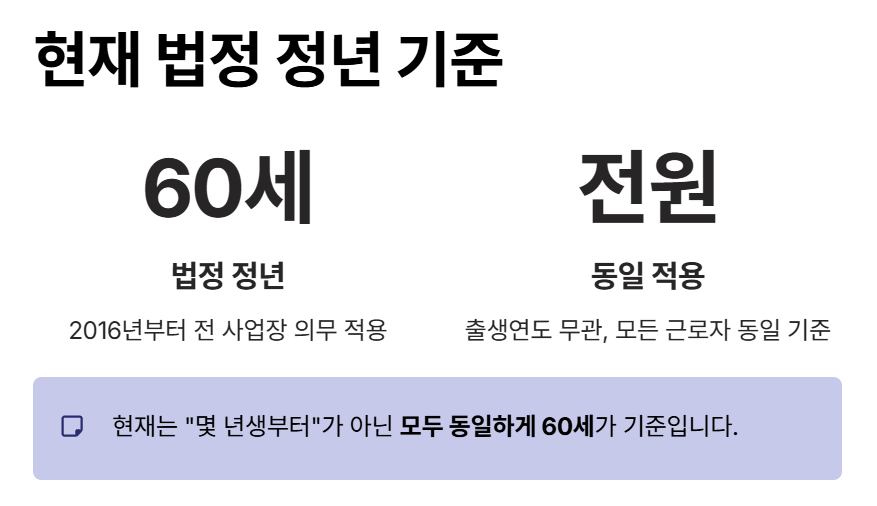 즉 현재 기준으로는 “몇 년생부터”라는 개념이 아니라 모두 동일하게 60세가 기준입니다.