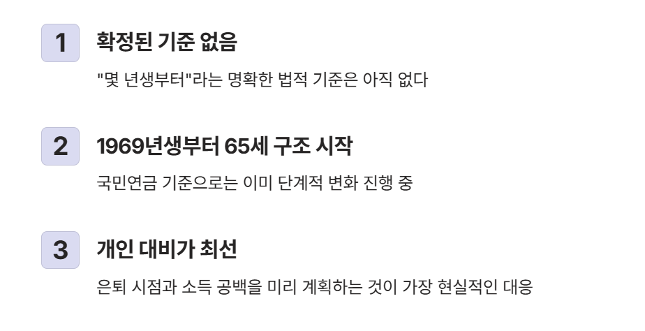 정년연장은 아직 확정된 제도가 아니기 때문에 “몇 년생부터 적용된다”는 명확한 기준은 없습니다. 다만 국민연금 기준으로 보면 1969년생부터 65세 구조가 시작되며, 정년연장 역시 이 흐름에 맞춰 단계적으로 도입될 가능성이 높습니다. 중요한 것은 정책을 기다리기보다 개인적으로 대비하는 것입니다. 은퇴 시점과 소득 공백을 미리 계획하는 것이 가장 현실적인 대응 방법입니다.