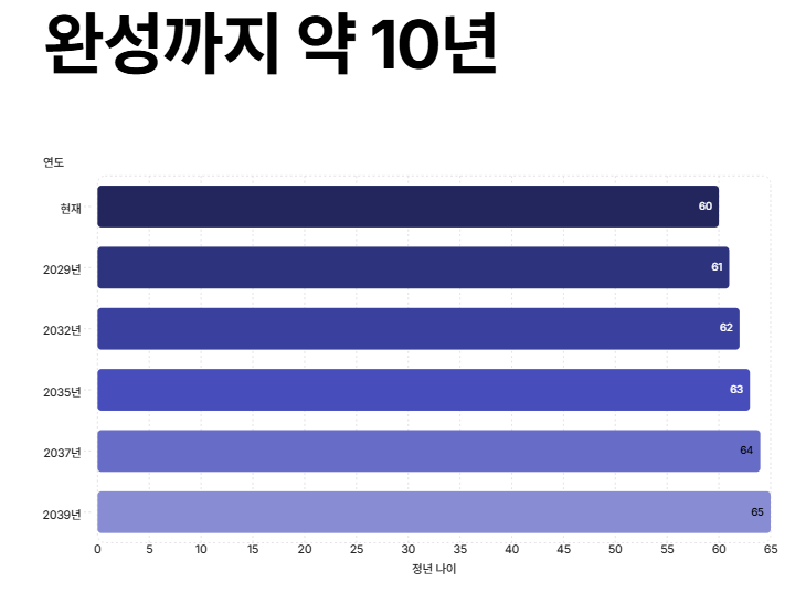 정년연장 65세는 아직 확정된 제도는 아니지만 2029년 전후로 단계적 시행 가능성이 높습니다. 완성 시점은 2039년 전후로 예상됩니다. 중요한 것은 시행 시기보다 적용 대상 여부입니다. 기준은 간단합니다. 60세 도달 시점이 시행 이후라면 적용될 가능성이 높습니다. 특히 1970년대 이후 출생자는 영향이 클 것으로 보입니다. 지금부터 본인의 은퇴 시점을 계산하고 대비하는 것이 가장 현실적인 전략입니다.