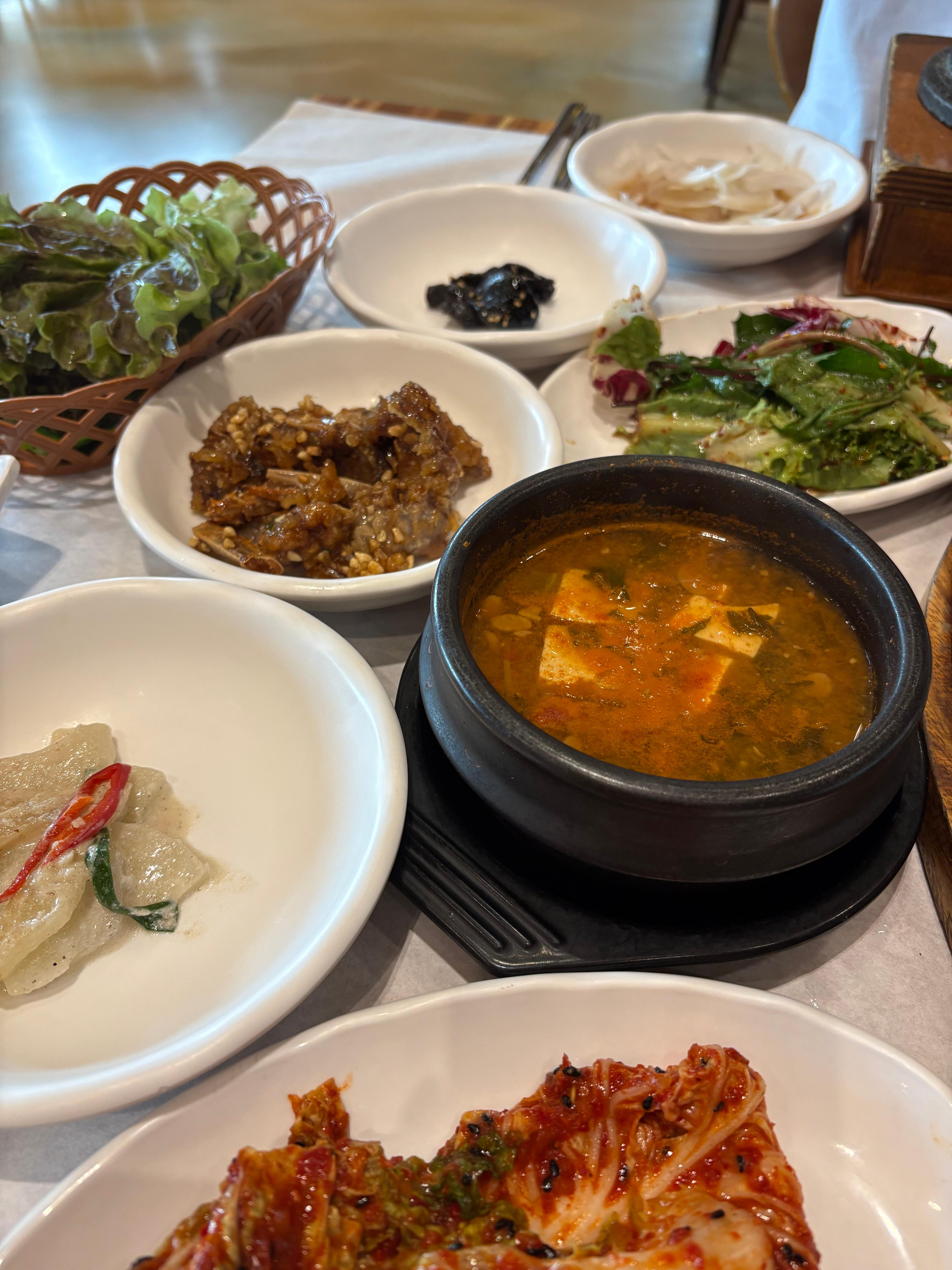 제가 먹었던 밑반찬 중에 맛있어던 음식을 말씀드리면, 간장 꽃게튀김이 아주 맛있었습니다. 밑반찬에 나오는 나물은 전체적으로 간이 그렇게 쎄지 않아서 좋았지만, 간장 꽃게튀김은 껍질도 억세지 않고 감칠맛이 풍부했어요. 추가로, 된장찌게에 돌솥밥을 비벼서 먹는 것도 일품이였습니다.