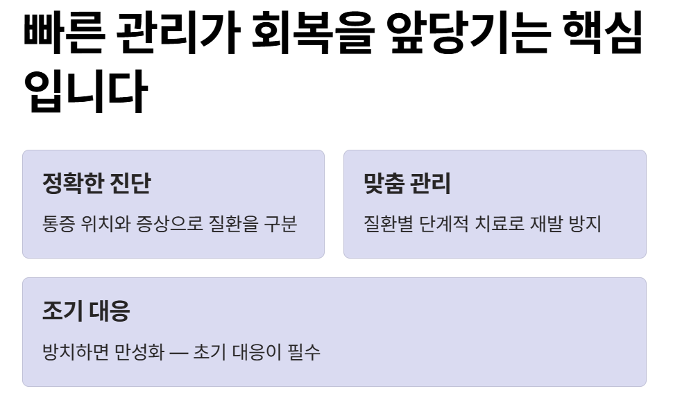 팔꿈치통증은 단순 근육통이 아니라 다양한 질환으로 발생할 수 있습니다. 특히 테니스엘보, 골프엘보, 활액낭염은 증상이 비슷해 혼동하기 쉽지만 통증 위치와 특징을 통해 충분히 구분할 수 있습니다. 질환에 따라 관리 방법이 다르기 때문에 정확한 판단이 중요합니다. 통증을 방치하면 만성화될 수 있으므로 초기부터 원인을 파악하고 적절히 대응하는 것이 필요합니다. 빠른 관리가 회복을 앞당기는 핵심입니다.
