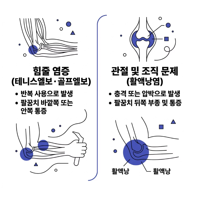 팔꿈치통증은 크게 두 가지 관점으로 구분할 수 있습니다.