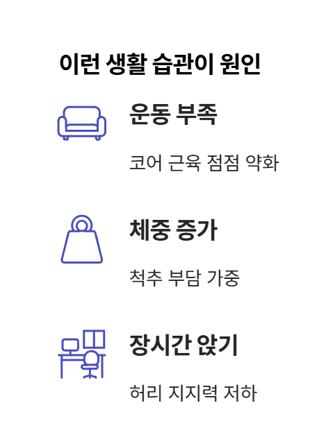 허리를 지탱하는 코어 근육이 약해지면 척추에 부담이 커지면서 통증이 발생할 수 있습니다.