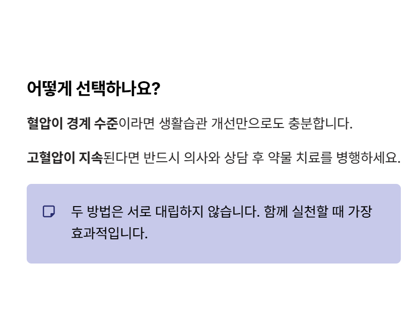 두 번째는 의료적 관리입니다. 혈압이 높은 상태가 지속되면 약물 치료가 필요할 수 있습니다.