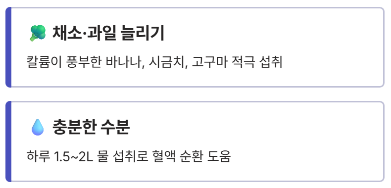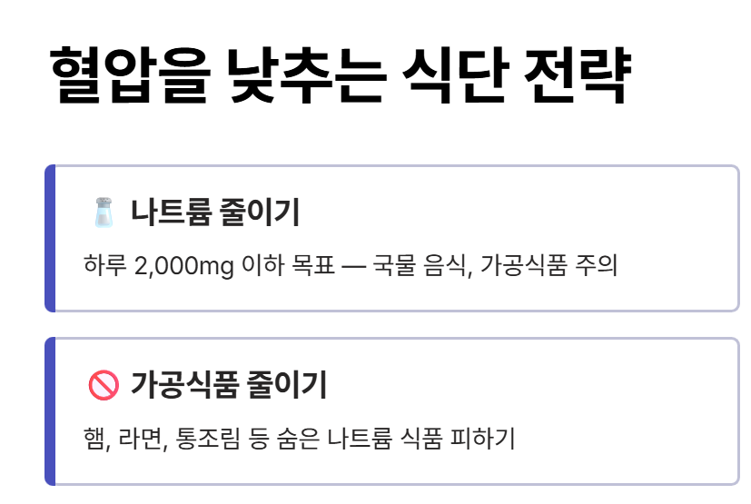 첫 번째는 생활습관 개선입니다. 식단과 운동을 통해 자연스럽게 혈압을 낮추는 방법입니다.