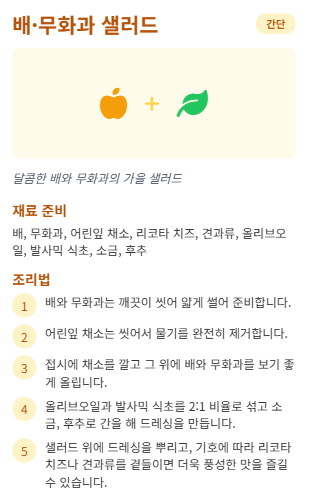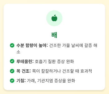 - 배: 수분이 많아 갈증 해소에 좋고, 기관지 건강에도 탁월합니다. 환절기 목이 자주 칼칼한 분들께 추천합니다.