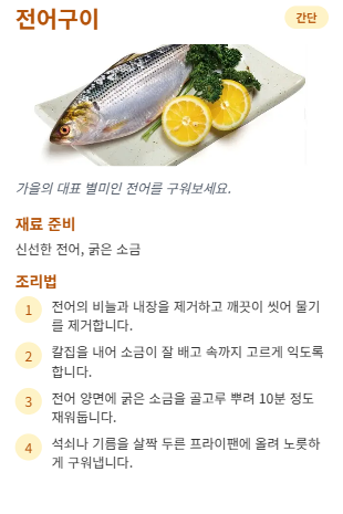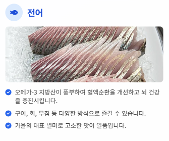 - 전어: 오메가-3 지방산이 풍부해 혈액순환과 뇌 건강에 좋습니다. 구이, 회, 무침 등으로 다양하게 즐길 수 있습니다.