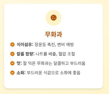 - 무화과: 식이섬유와 칼륨이 풍부해 변비 예방과 혈압 조절에 효과적입니다.