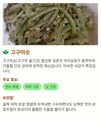 - 고구마순: 항산화 성분과 식이섬유가 풍부해 변비 예방과 피부 건강에 유익합니다. 된장무침으로 드시면 제격입니다.