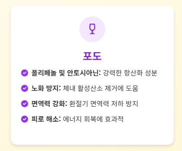 - 포도: 폴리페놀과 안토시아닌이 풍부해 항산화 효과가 뛰어나고, 환절기 면역력 강화에 도움을 줍니다.