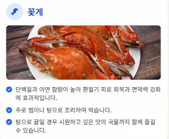 - 꽃게: 단백질과 아연이 많아 피로 회복과 면역력 강화에 도움이 됩니다. 찜이나 탕으로 먹으면 국물까지 시원하게 즐길 수 있습니다.