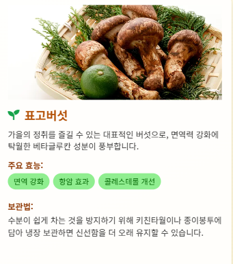 - 표고버섯: 면역력 강화에 좋은 베타글루칸이 풍부합니다. 볶음이나 전골에 넣어 드시면 좋습니다.